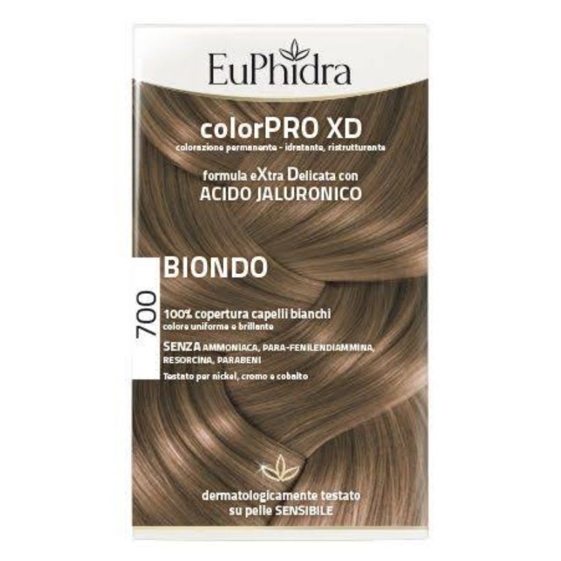 Euphidra Colorpro XD 700 është një ngjyrë permanente për flokë me ton të natyrshëm biondo. Ky produkt ofron mbulim të plotë të thinjave dhe ngjyrosje të qëndrueshme. Formulimi është ekstra i butë, pa amoniak, resorcina, parabene dhe para-fenilendiaminë, duke e bërë të sigurt për përdorim në lëkurë të ndjeshme. Përmban acid hialuronik që hidraton flokët, si dhe proteina silke dhe keratinë që forcojnë dhe rigjenerojnë flokët, duke u dhënë shkëlqim dhe butësi pas ngjyrosjes.