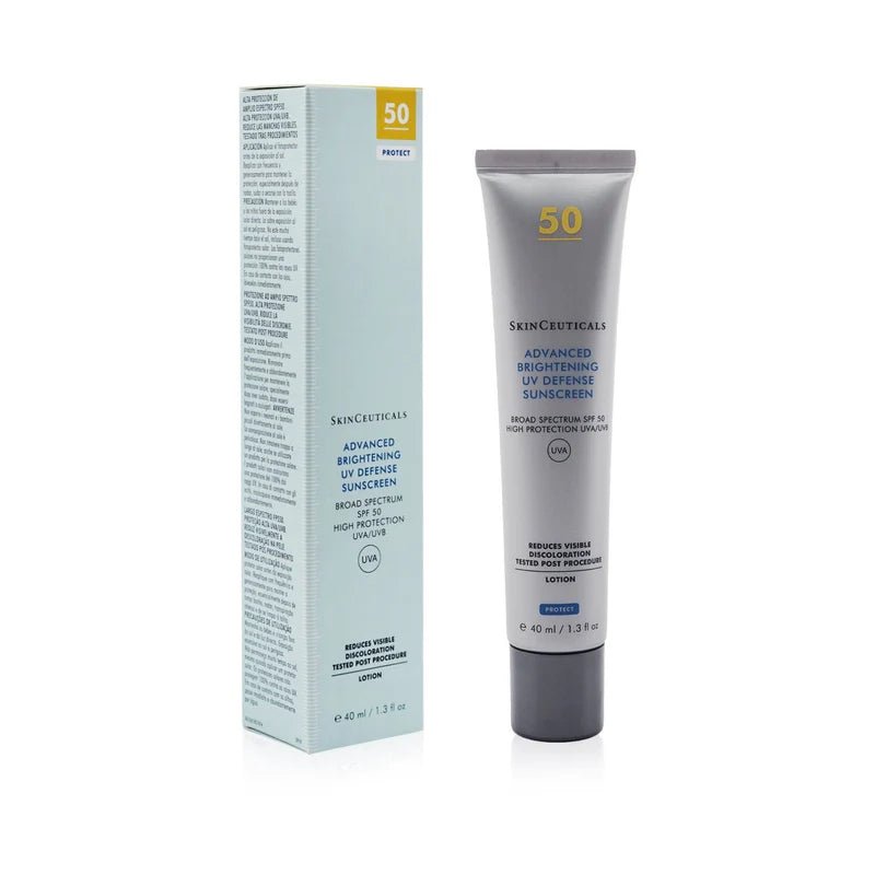 SkinCeuticals Advanced Brightening UV Defense Sunscreen SPF 50 (40 ml) është një krem me dy veprime: mbrojtje e gjerë UVA/UVB dhe koreksion i hiperpigmentimit. Formulë ultra–e lehtë dhe pa mbetje “white cast”, krijuar për zbutjen dhe parandalimin e njollave të errëta. Përmban 1 % acid traneksamik për të reduktuar formimin e melaninës dhe 2 % niacinamide për të penguar transferimin e pigmentit në qelizat e lëkurës, duke ndriçuar dhe unifikuar tonin e lëkurës (dermacaredirect.com). Formula e bojshme përfshin mbrojtës efektiv UV dhe rregullues të shkëlqimit për një përfundim natyral dhe të ndritur .
