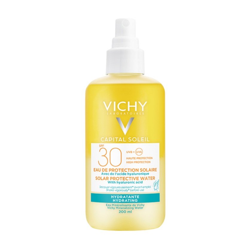 Vichy Capital Soleil Solar Protective Water SPF30 ofron mbrojtje të lartë për fytyrën dhe trupin. Formula bi-fazë përthithet shpejt, nuk lë ndjesi të yndyrshme dhe nuk krijon shenja të bardha në lëkurë.