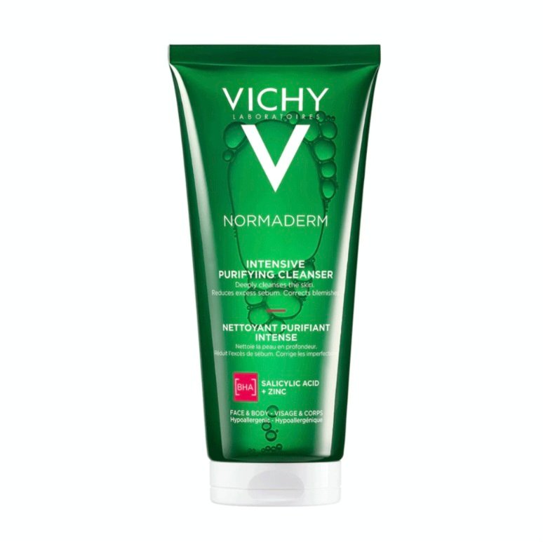 Vichy Normaderm Intensive Purifying Cleanser (200 ml) është një xhel pastrues i formuluar për lëkurën e yndyrshme dhe me tendencë akneike. Ky pastrues pastron thellësisht lëkurën, heq papastërtitë dhe mbetjet e makijazhit, duke lënë lëkurën të freskët dhe të pastër. Përmban Acid Salicilik (BHA) për eksfolim të butë dhe Zink Glukonat për të kontrolluar yndyrën dhe për të pastruar poret. Ky produkt është i përshtatshëm për përdorim të përditshëm dhe është testuar dermatologjikisht për lëkurë të ndjeshme.